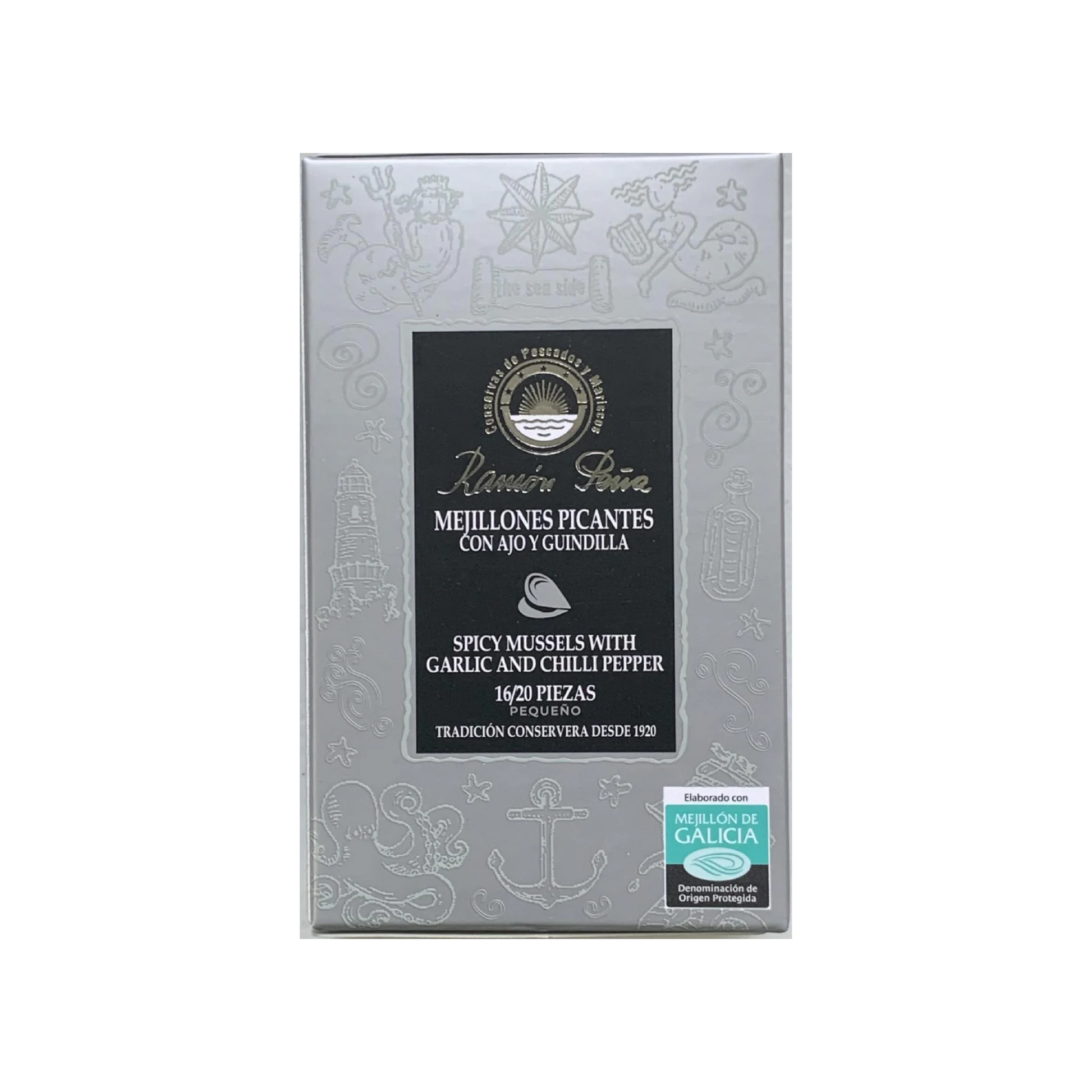 These mussels come from the Galician estuaries, within a Protected Denomination of Origin. Like every product from Ramón Peña, the mussels are obtained at the peak season and in limited quantities. The product is carefully selected and only the best pieces will be processed for canning and they are packed by hand with their own spicy sauce recipe. These are beautifully arranged and ready to be enjoyed straight from the tin.